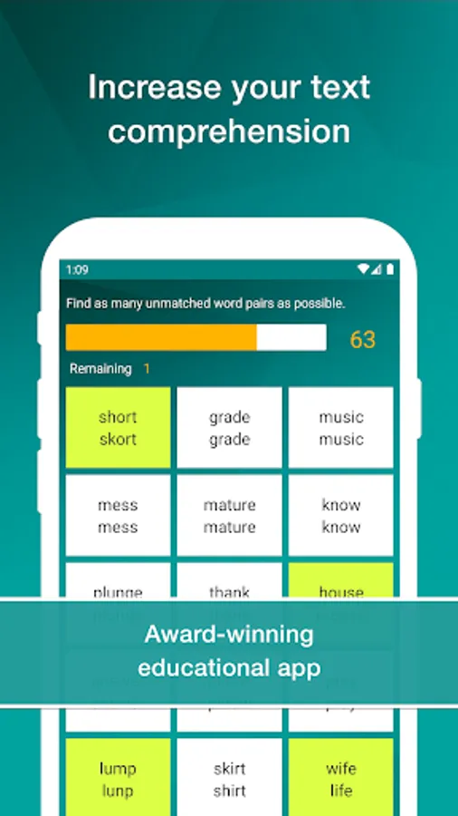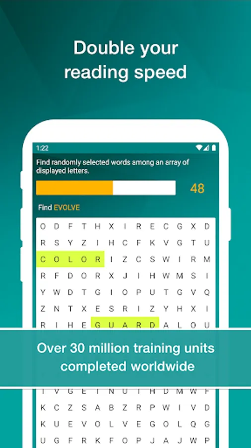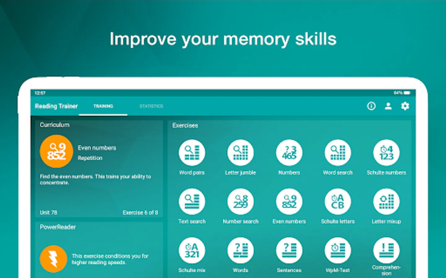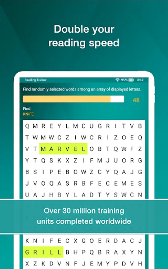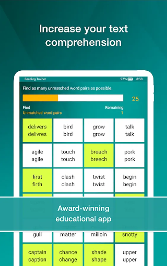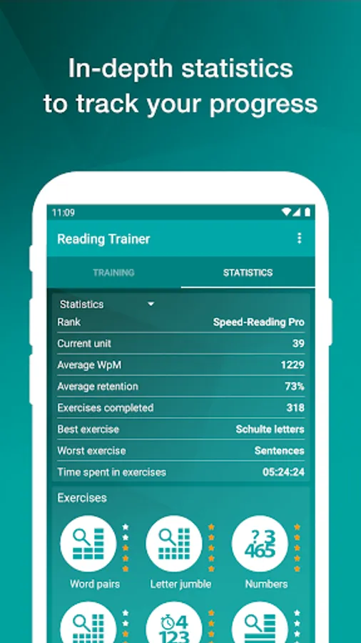 Reading Trainer improves your reading speed and retention rate with many challenging and fun exercises.