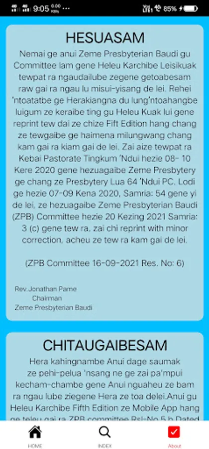 Nemai ge anui Zeme Presbyterian Baudi gu Committee lam gene Heleu Karchibe App tewpat ra ngaudailube zegene getoabesam raw gai ra ngau lu misui-yisang de lei. Rehei ’ntoatatbe ge Herakiangna du lung’ntoahangbe luigum ze keraibe ting gu Heleu Kuak lui gene reprint tew dai ze chize Fift Edition hang chang ze tewgaibe ge haimena milungwang chang kam gai ra kiam gai de lei.Zai aize tewpat ra Kebai Pastorate Tingkum ’Ndui hezie 08- 10 Kere 2020 gene hezuagaibe Zeme Presbytery ge chang ze