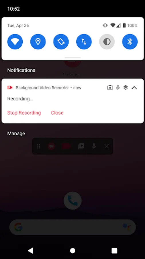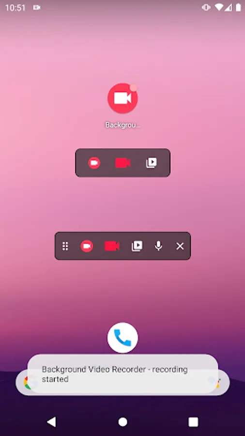 Application to record video in the background using a widget, notification panel or popup on top of all applications.