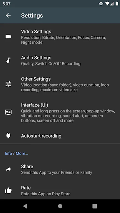 * Camera selection - you can use any camera for recording (rear/front), but only some devices allow you to select a camera with a wide angle lens