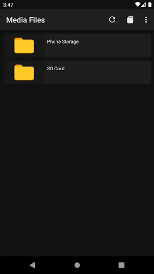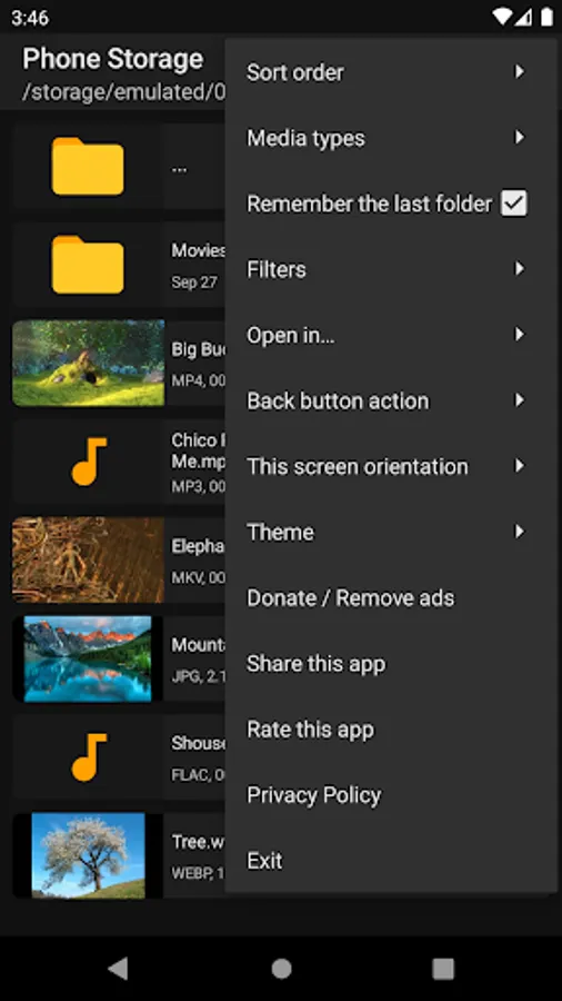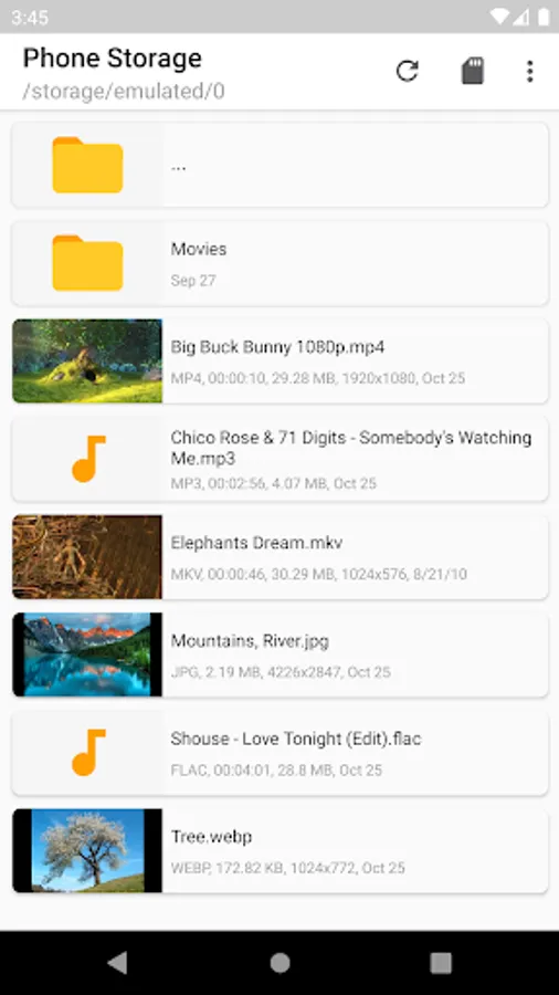 This is media explorer (browser / manager) app which only shows video, audio (music) and image (photo) files and only folders and subfolders which contain such media files on your device. It won't display folders which don't include any media files.