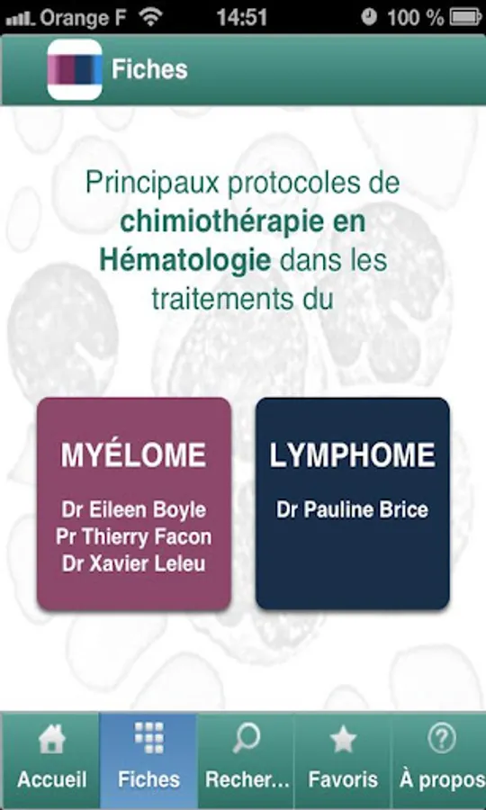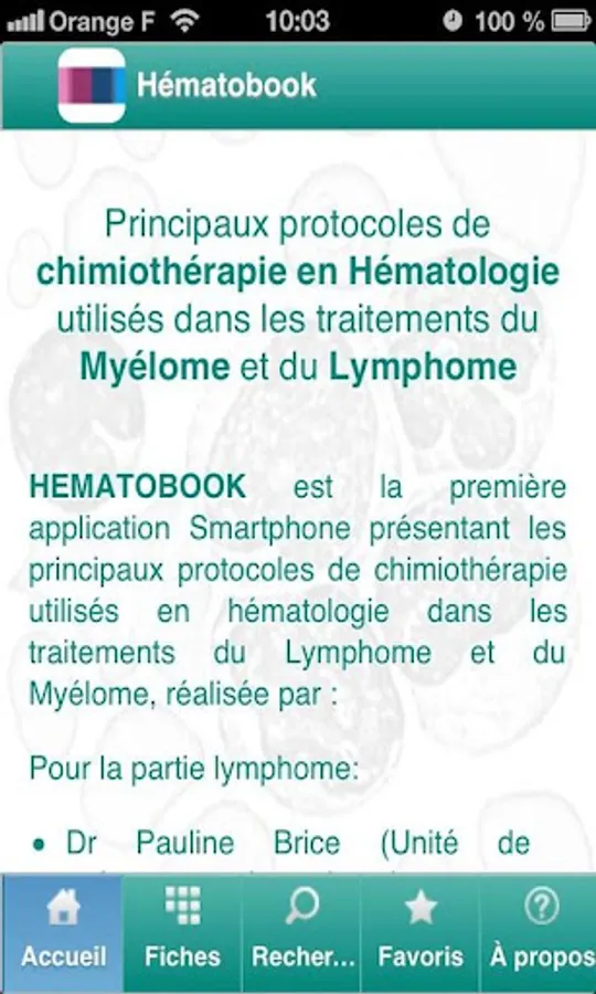 This first application presents the main chemotherapy regimens used in the treatment of hematology and Lymphoma Myeloma conducted by: