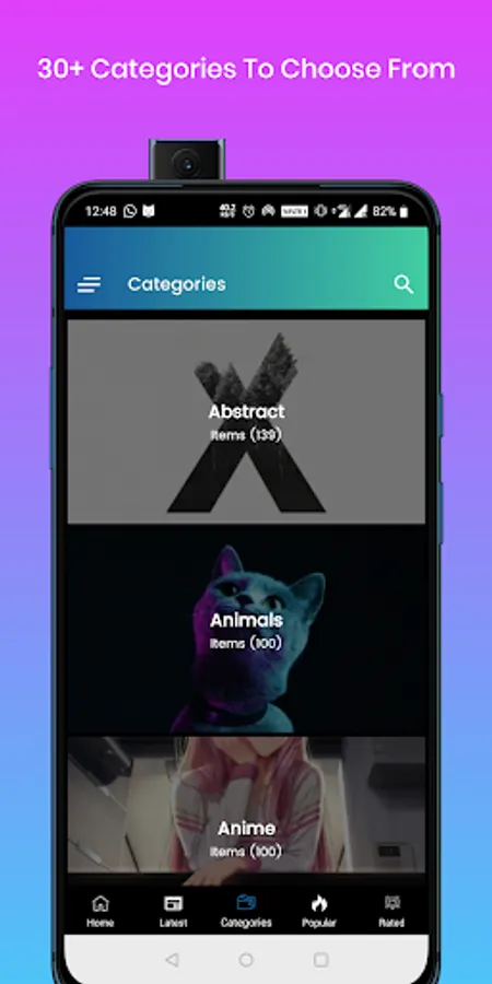 - Abstract, Aesthetic, Animals, Anime, Architecture, Artwork, Birds, Boys, Cars, Celebrities, Dark, Dope, Flowers, Football, Gaming, Girls, Glitch, Gradient, Love, Marvel, Minimal, Movies & TV, Nature, Ocean, PUBG, Quotes, Random, Space, Street.