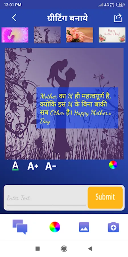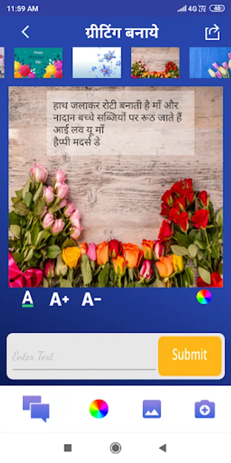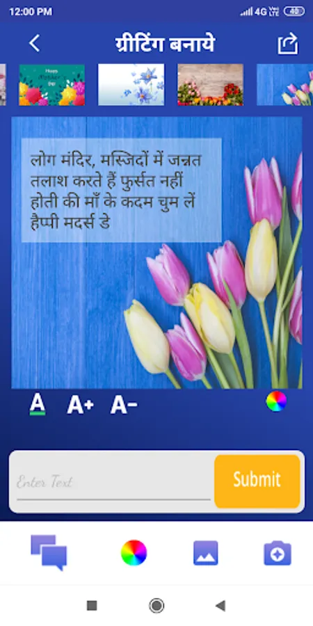 You can create your own quotes or Wishes with multiple stylish options like setting background images using a camera or gallery and also using predefined background images, changing the font, text size, text colour & more.