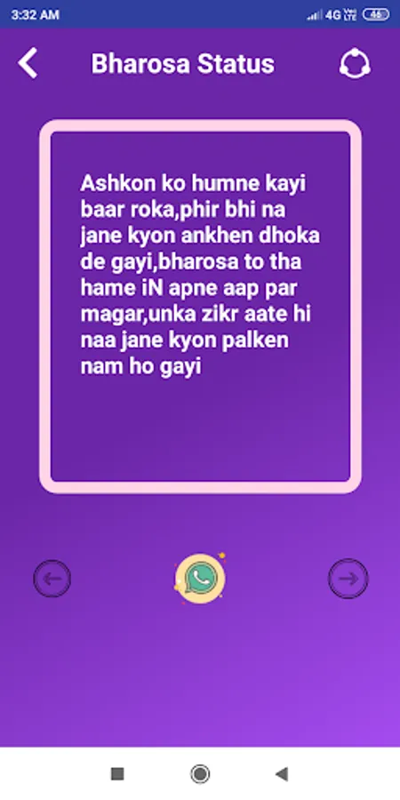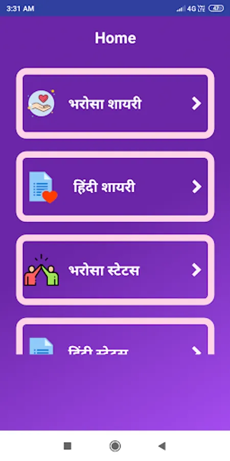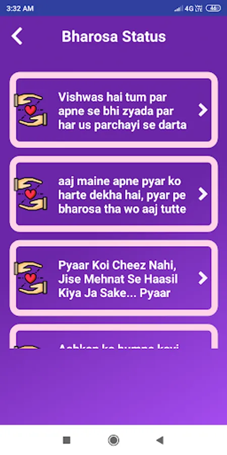 Bharosa Shayari Status app is a great status application having various categories like Hindi,English and Other.