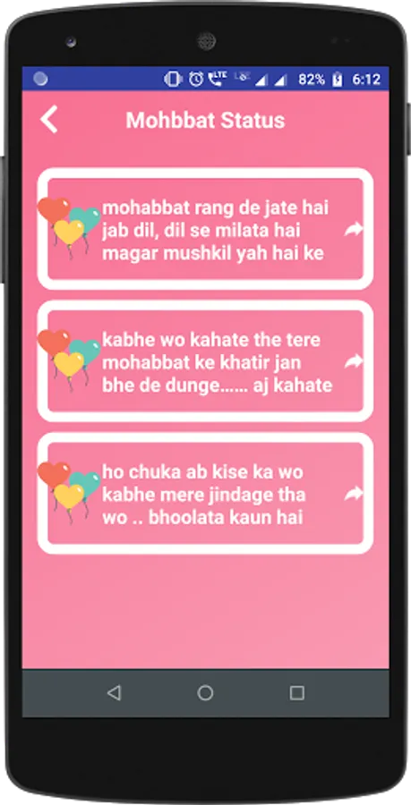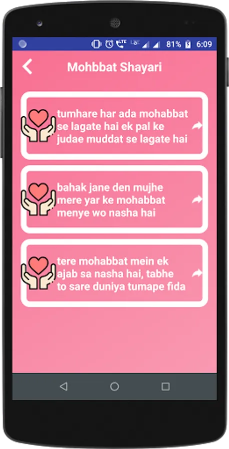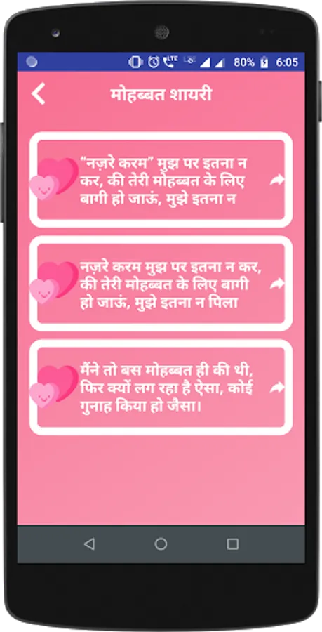 Mohabbat is the Hindi word for love. love is always attached with the romatic destination. This app is full of fun and you can share this shayari and quotes to your friends and lovers.