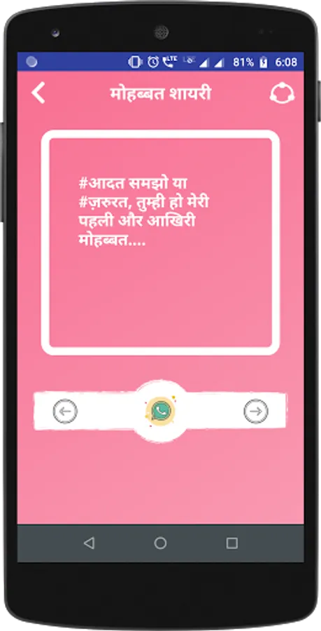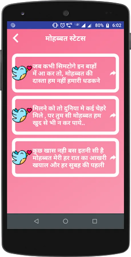 Mohabbat Shayari Status is unique poetic way to express yourself your feelings in Love . This app is the right place for Specially Mohabbat Shayari Hindi every Best in class categories.