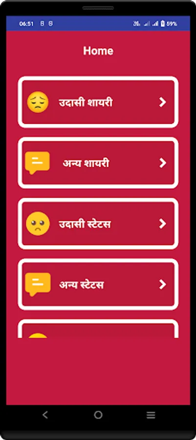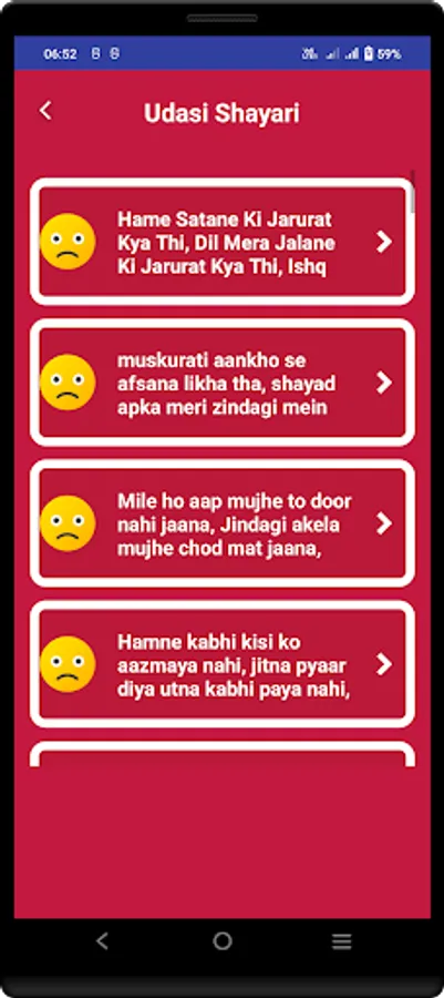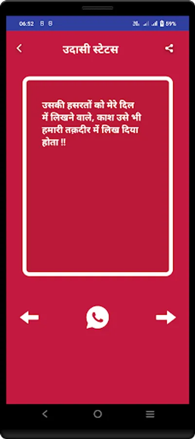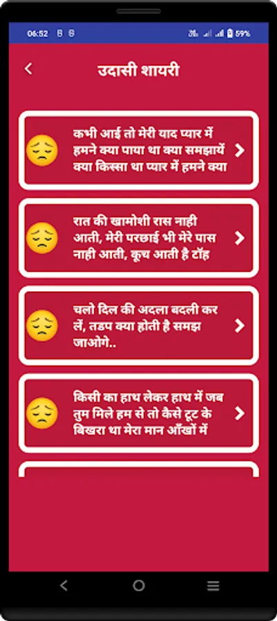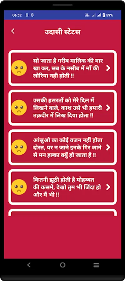 This app contains Largest Collection of Udasi Shayari, Sad Status and Heart Breaking Shayari Status in hindi.