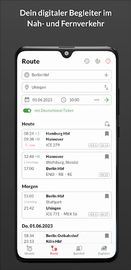 Simply enter the start and destination station, local public transport stops also work, select the date and time, and all trains, transfers and, if necessary, footpaths are displayed, which will quickly take you to your destination. Do you have the Germany ticket? Then activate the corresponding switch so that only the connections for which the ticket is valid are displayed.