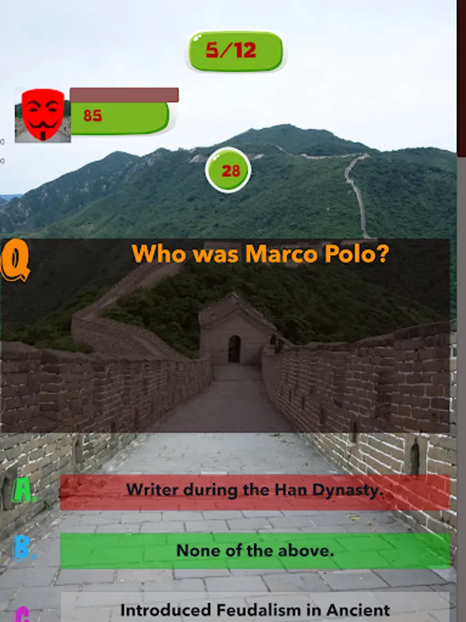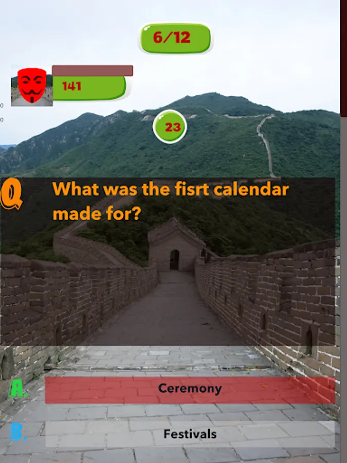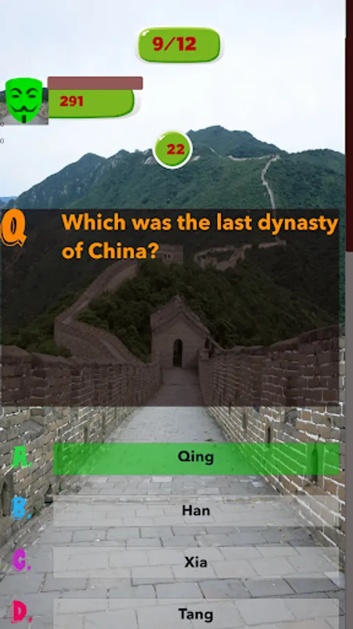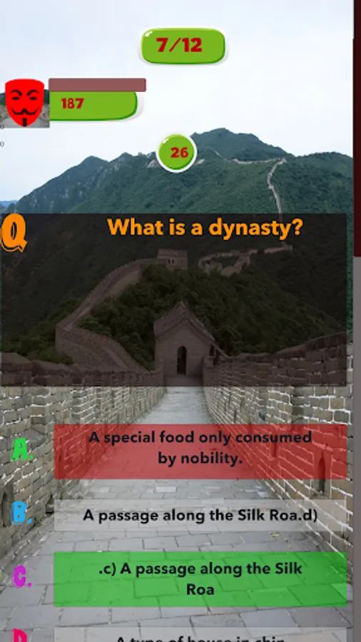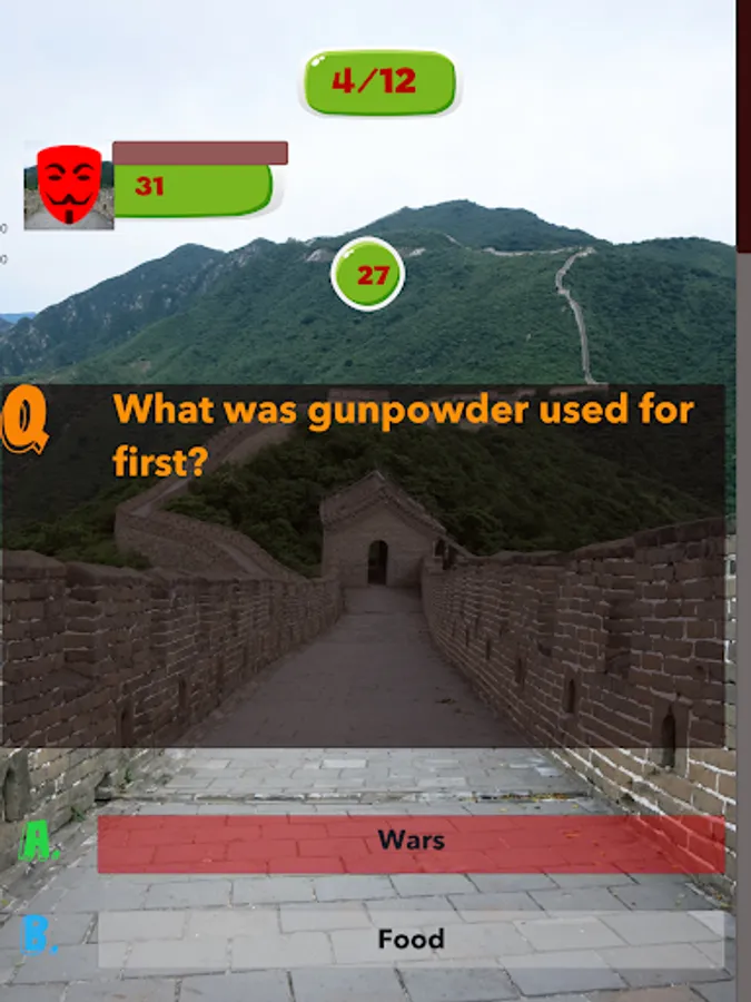 This China Knowledge game helps user to sharpening their knowledge and senses, help them to prepare for exams or tests which are based on all Aspects of Chinese History and helps them to increase their knowledge. This app targets people of all ages, even children could enjoy tests created by this app and could enhance their Chinese Knowledge. This app can be used for the preparation of School, Collage and Universities quizzes and also for entry tests. This app contains cool features like coloring the buttons green if the answer is correct otherwise coloring the button red because the answer is wrong. It provides multi-player functionality which enables you to play against the players around the world. It contains good graphics and less Ads. This app is extremely efficient, it is developed in such a way so that it could run smoothly in any device.