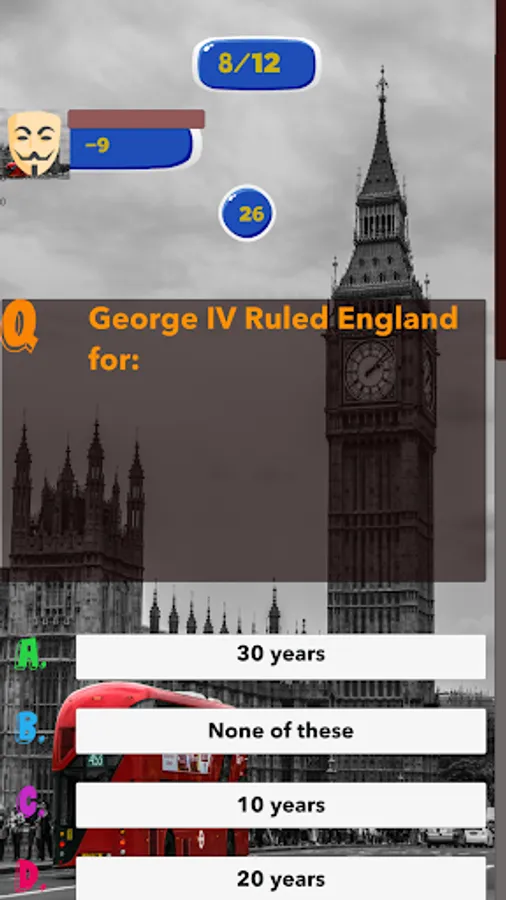 This England knowledge game helps user to sharpening their knowledge and senses, help them to prepare for exams or tests which are based on all Aspects of British History and helps them to increase their knowledge. This app targets people of all ages, even children could enjoy tests created by this app and could enhance their United Kingdom Knowledge. This app can be used for the preparation of School, Collage and Universities quizzes and also for entry tests. This app contains cool features like coloring the buttons green if the answer is correct otherwise coloring the button red because the answer is wrong. It provides multi-player functionality which enables you to play against the players around the world. It contains good graphics and less Ads. This app is extremely efficient, it is developed in such a way so that it could run smoothly in any device.