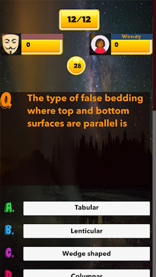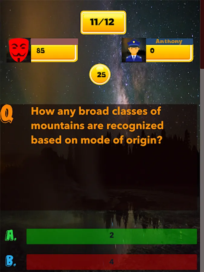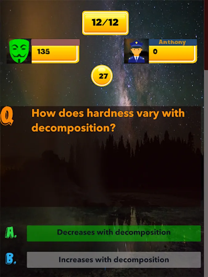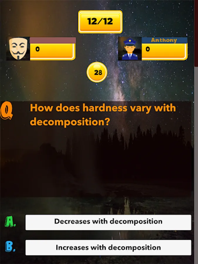 This Geology game helps user to sharpening their knowledge and senses, help them to prepare for exams or tests which are based on all branches of Geology and helps them to increase their knowledge. This app targets people of all ages, even children could enjoy tests created by this app and could enhance their Geology Knowledge. This app can be used for the preparation of School, Collage and Universities quizzes and also for entry tests. This app contains cool features like coloring the buttons green if the answer is correct otherwise coloring the button red because the answer is wrong. It provides multi-player functionality which enables you to play against the players around the world. It contains good graphics and less Ads. This app is extremely efficient, it is developed in such a way so that it could run smoothly in any android device.