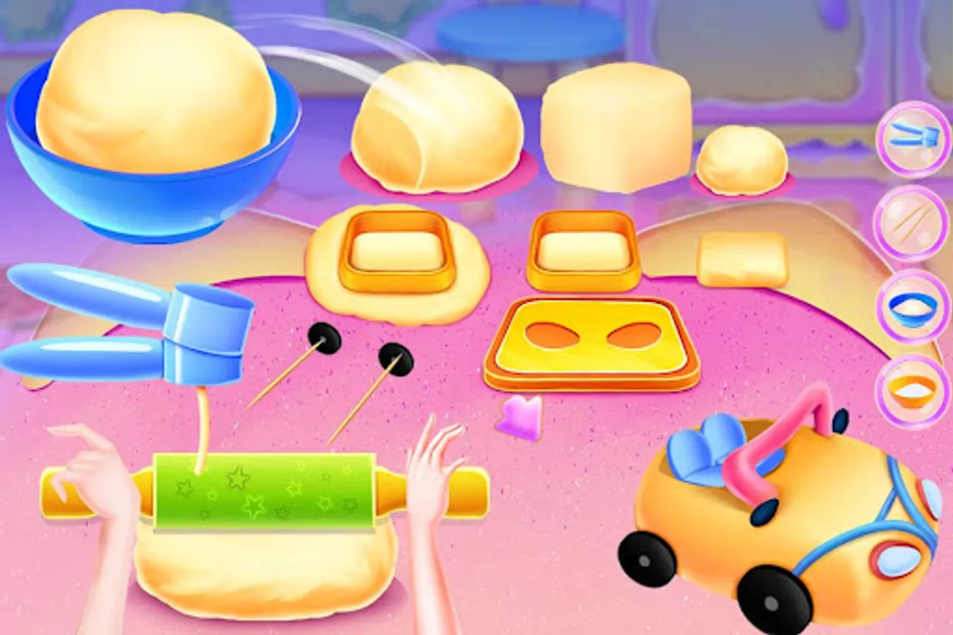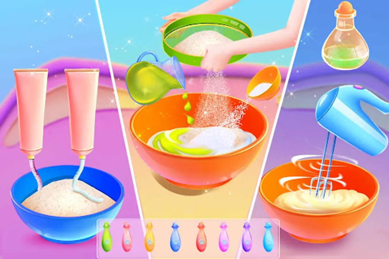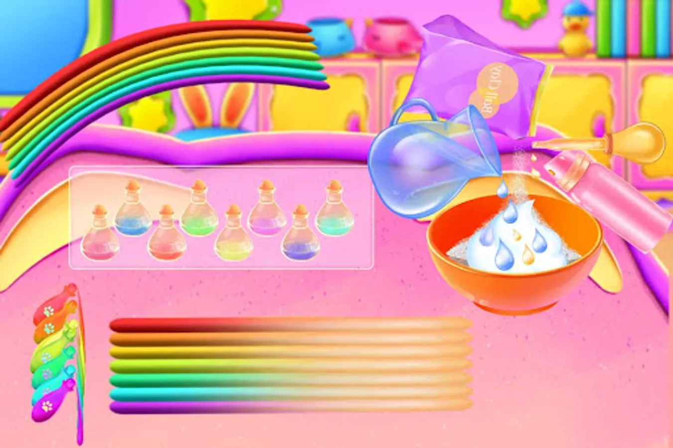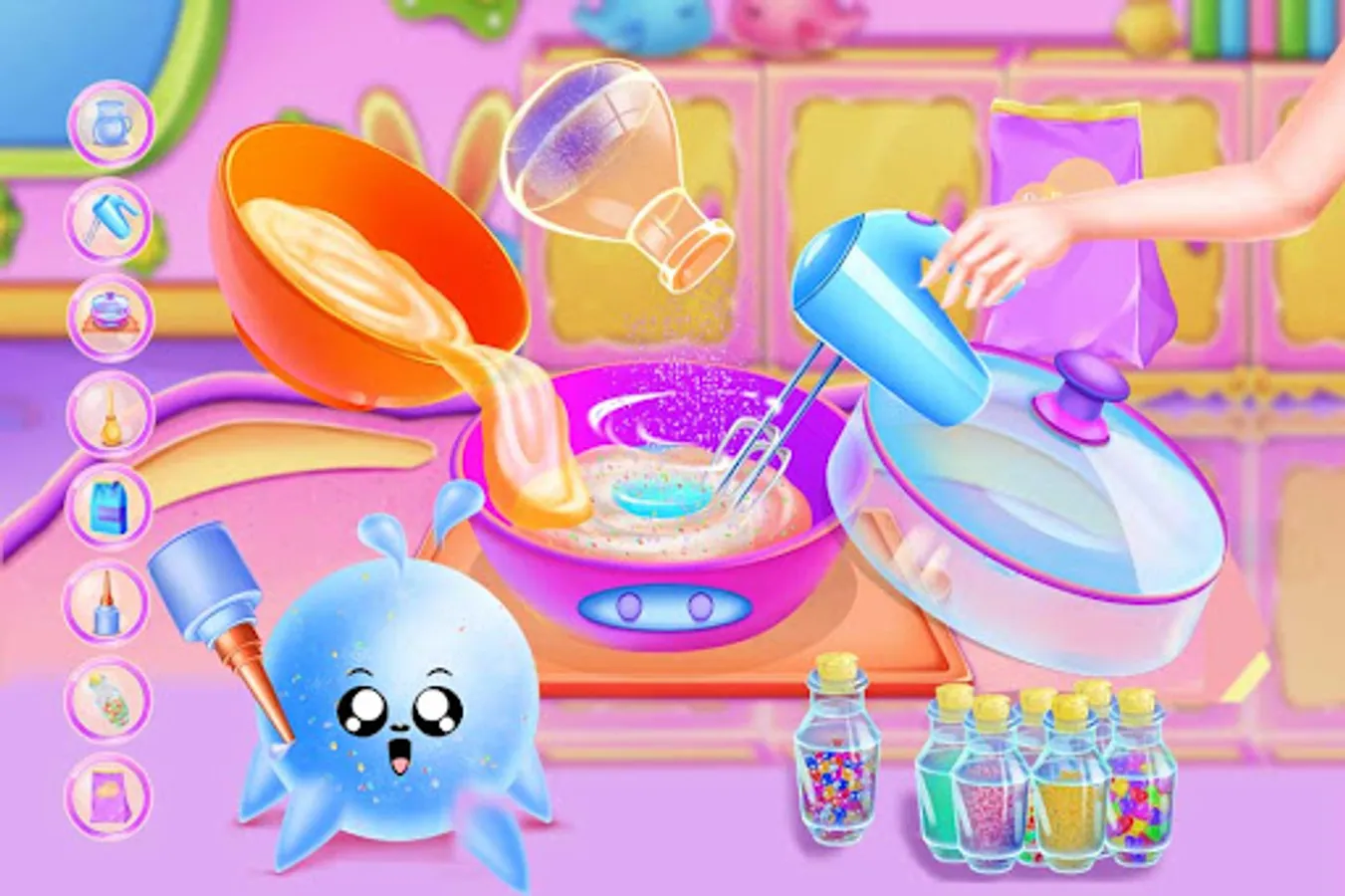 Explore the magical slime world, where there are different toys to choose from, like making slime little monsters, cars, rainbows, soft pottery windmills and more.You can experience different production materials, such as borax, paint, flour, olive oil, etc.We can click, knead, and make Slime into a part we need.You can also add your favorite bright powder and small decoration, but also change your favorite colors to different parts.The final made parts together form a slime piece.Play your creative ideas and make a magical Slime toy.