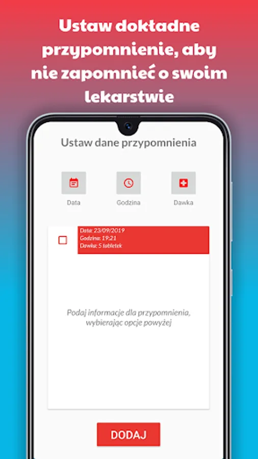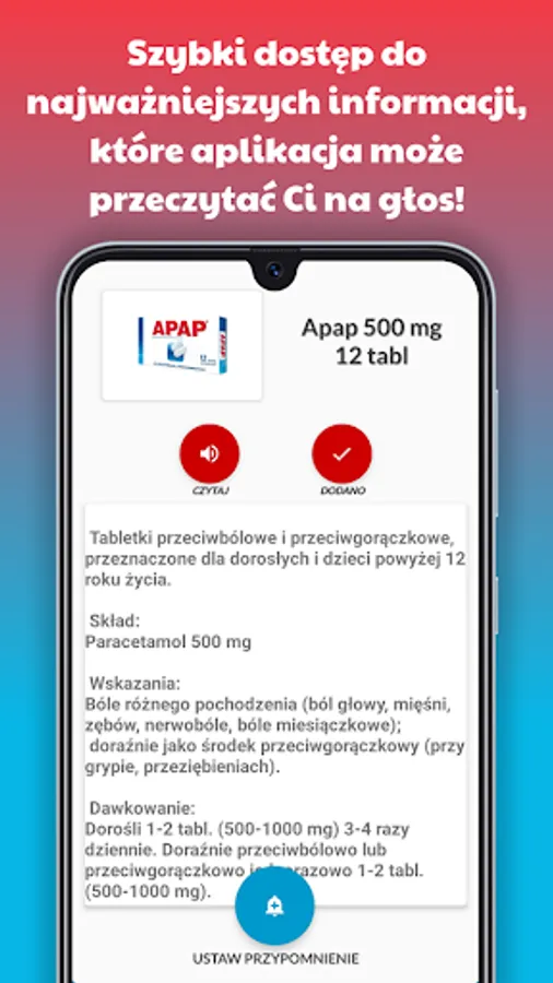 - displaying information about the medicine and the ability to read it (it is necessary to have speech synthesizer support for the Polish language)