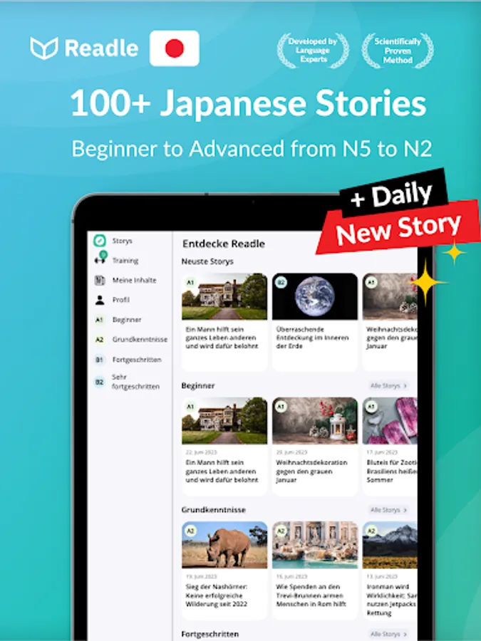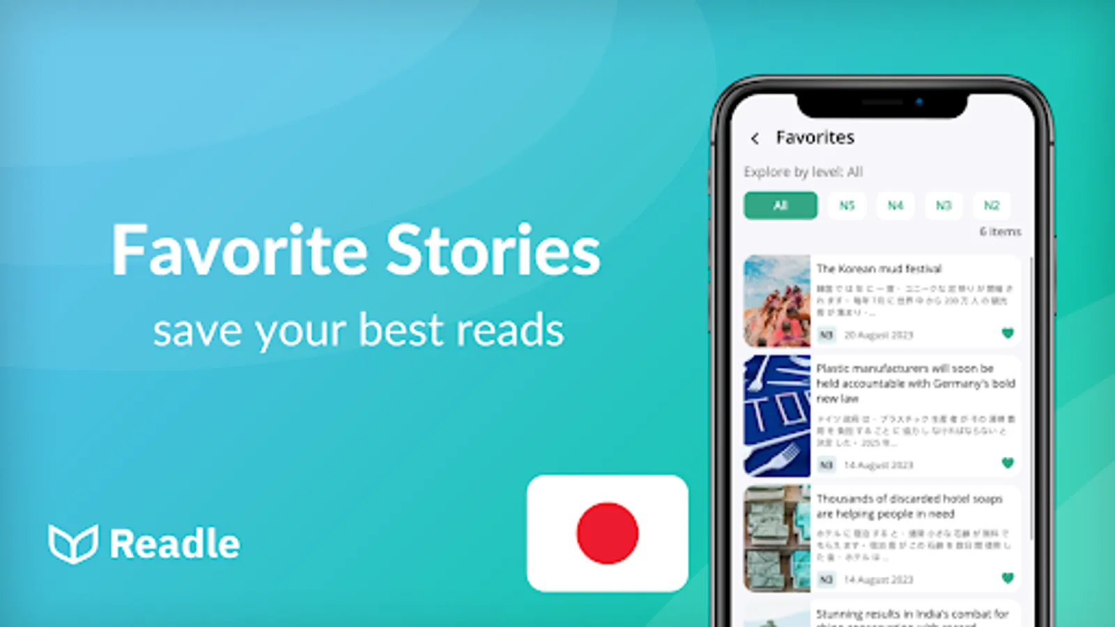 Immerse yourself in real-world news and stories, boosting your skills from beginner N5 to advanced N2 JLPT levels. Read and listen to Japanese content anytime, anywhere, and expand your vocabulary in just 10 minutes a day. Start learning Japanese the new way with Readle today!
