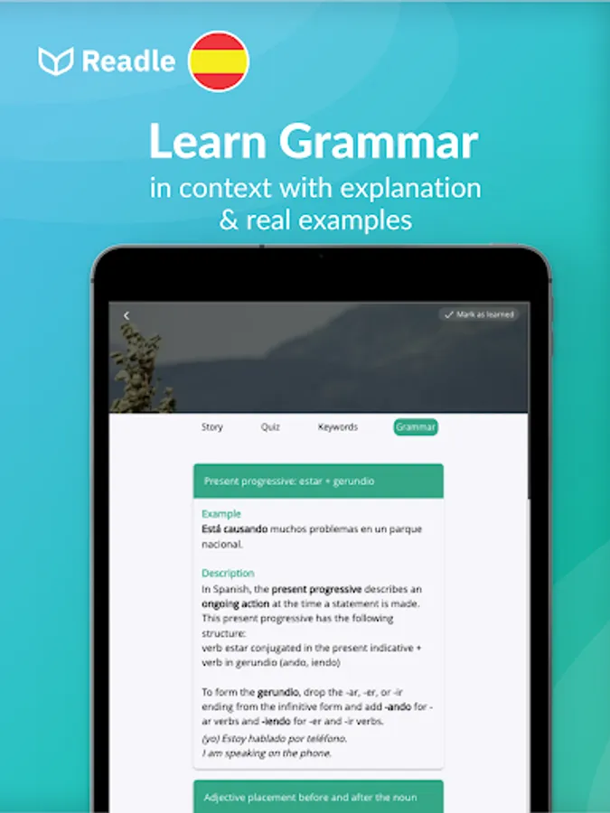 +1000 interesting stories & news for you to learn Spanish. Readle allows you to learn them effectively in context, including grammar tips and vocabulary flashcard training.