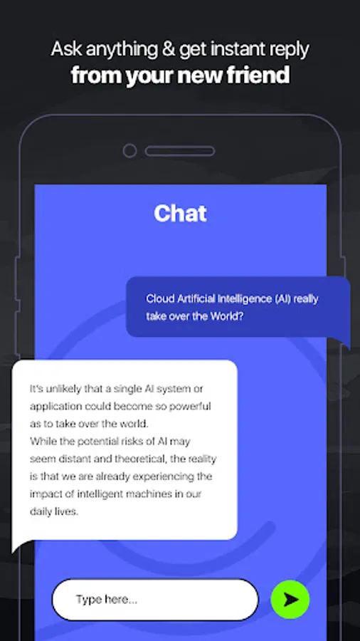 You can consider HelloAI as your virtual friend/assistant and ask whatever questions you want. This app is using the GPT-3.5-turbo model. You will feel as if you're conversing with an intelligent friend thanks to the advanced and powerful AI-powered technology that comprehends your questions and produces human-like responses.