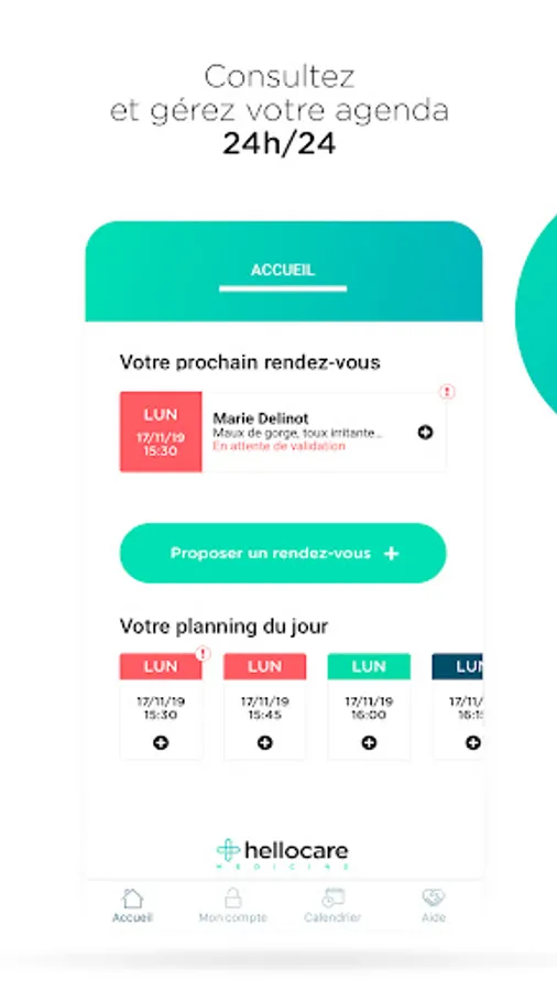 The Hellocare Pro application allows liberal practitioners (doctors, psychologists, dieticians, etc.) to optimize the management of their medical practice and communication with their patients.