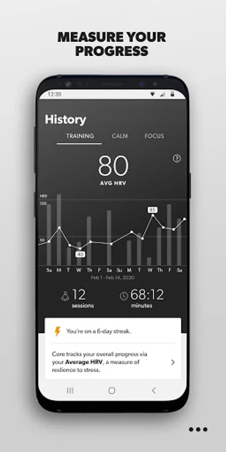 After each meditation, Core will show you how Calm and Focused you were. Long-term historical graphs lets you see how your resilience to stress is changing over time, and track your progress with daily streaks.