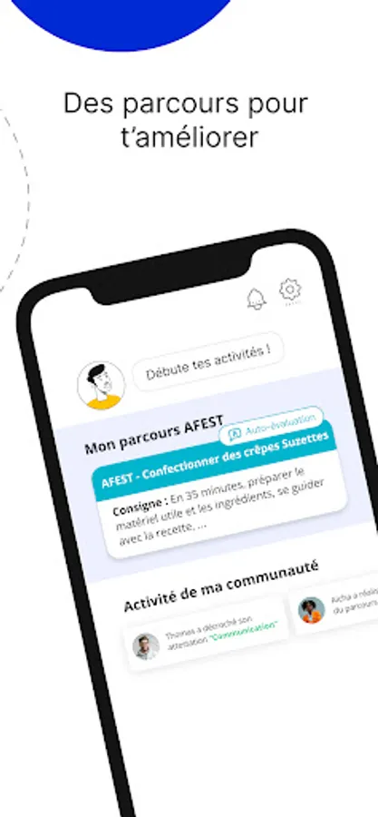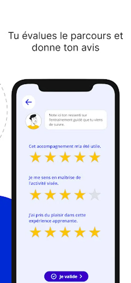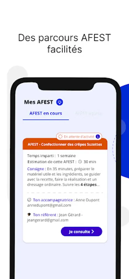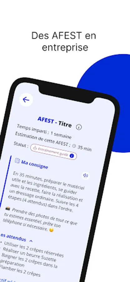 The learner employee will also have access to the application in order to see the instructions, self-evaluate on the actions, then have access to his evaluations and all his experiences of AFEST, his own increase in competence. While being guided, the learner is the first actor of his learning.