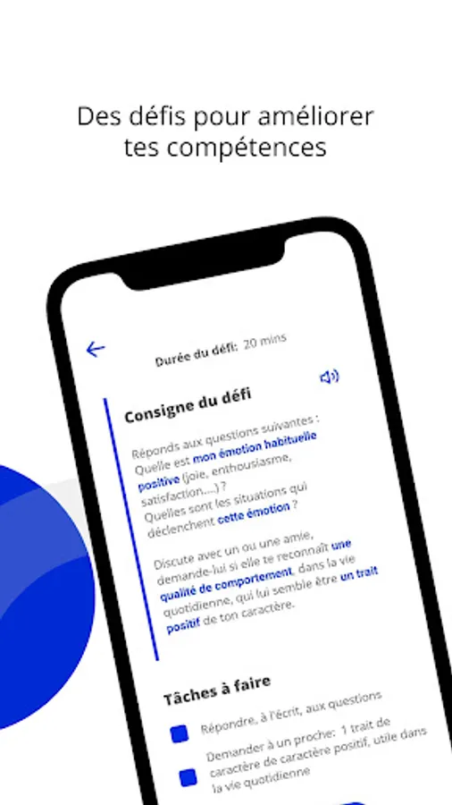 After each challenge, the user answers a series of questions intended to make him gain perspective on his actions, this is the reflective phase. He is thus challenged in his progress.