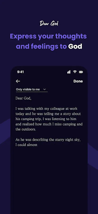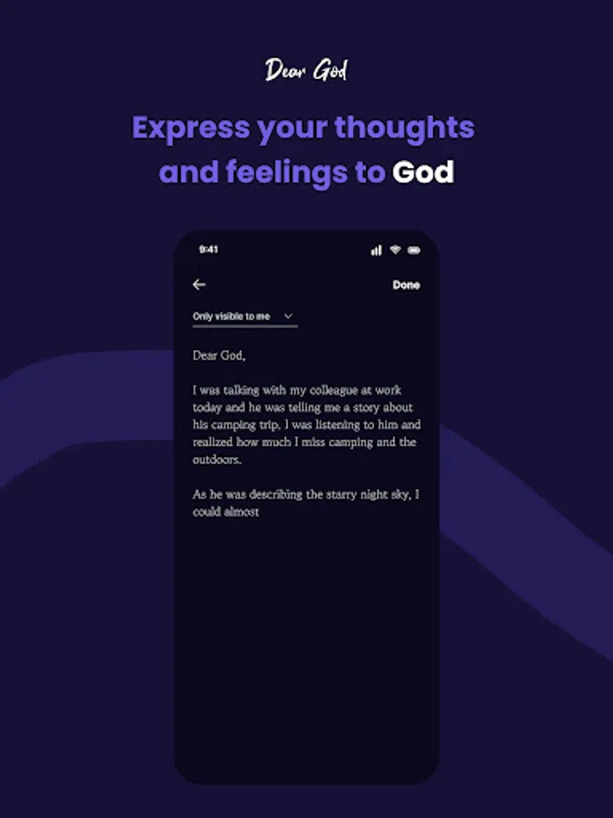 Use this app on your spiritual journey with God to document diverse moments in your life. Don't worry, it doesn't need to be perfect.