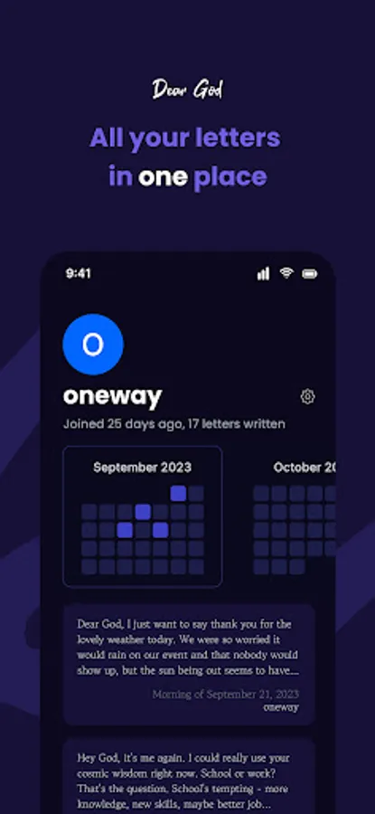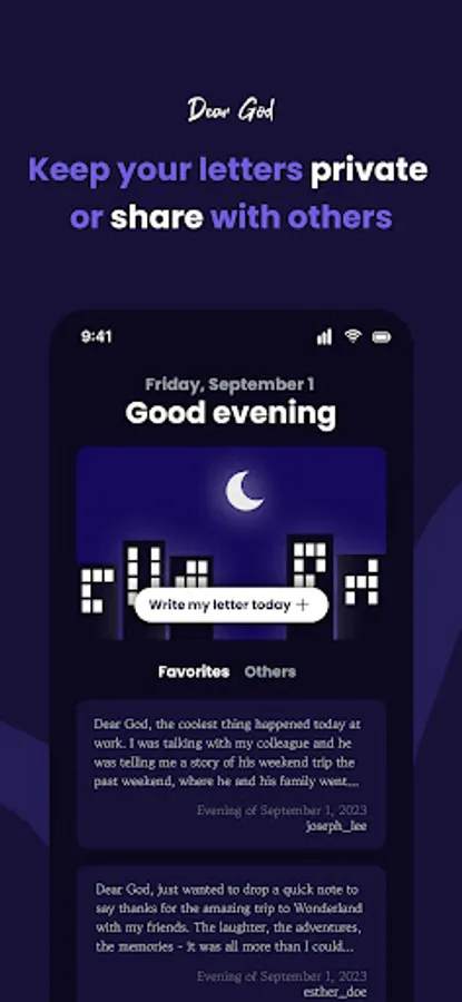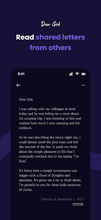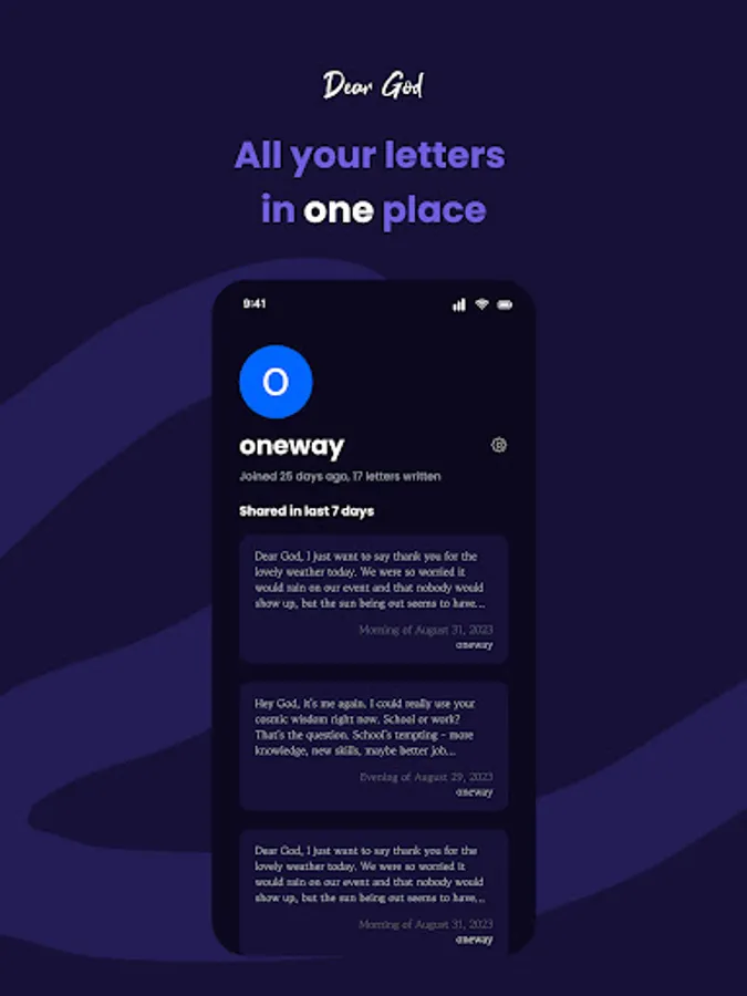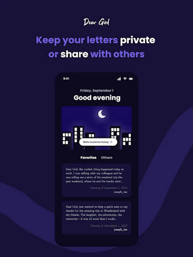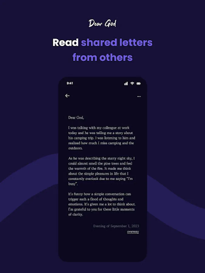 This is a place where you can openly write down your thoughts and feelings to God. On each letter, you can choose to keep it private or share with others.