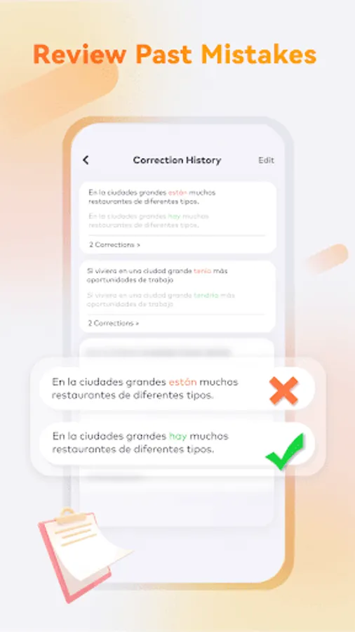 AI Spanish also provides a Correction History feature, allowing you to compare your past mistakes and corrections. This aims to help you progressively learn and avoid repeating the same errors, enhancing your writing skills and grammar proficiency.