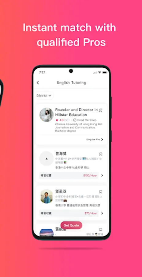 Based on your service requirements, Toby will match you with the right Pros instantly. You can compare their profiles, check service items and quotes, contact them directly, and finally choose the one that suits you best.