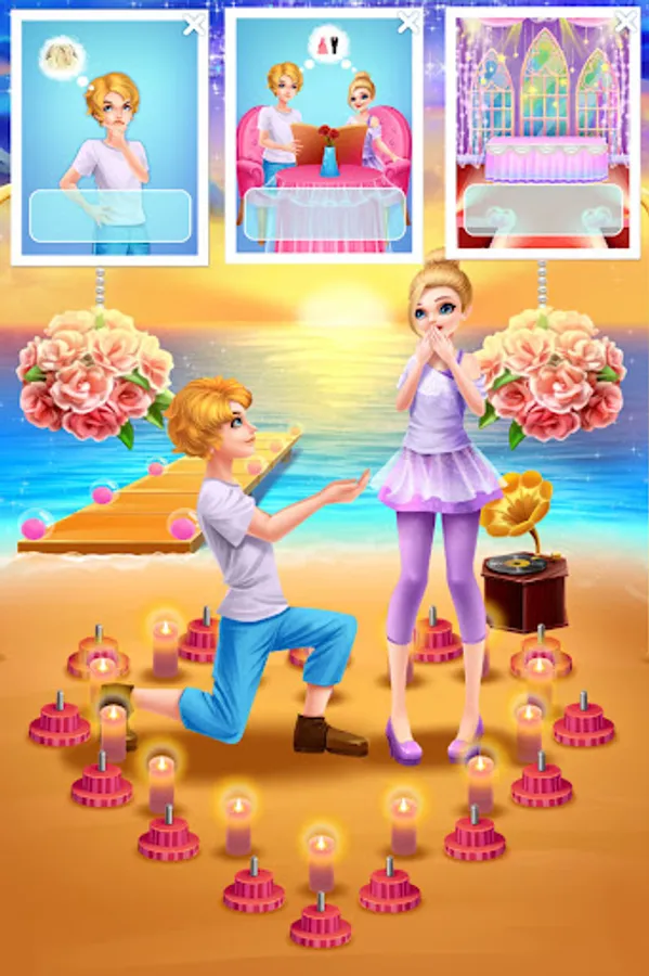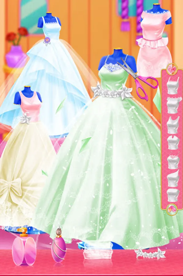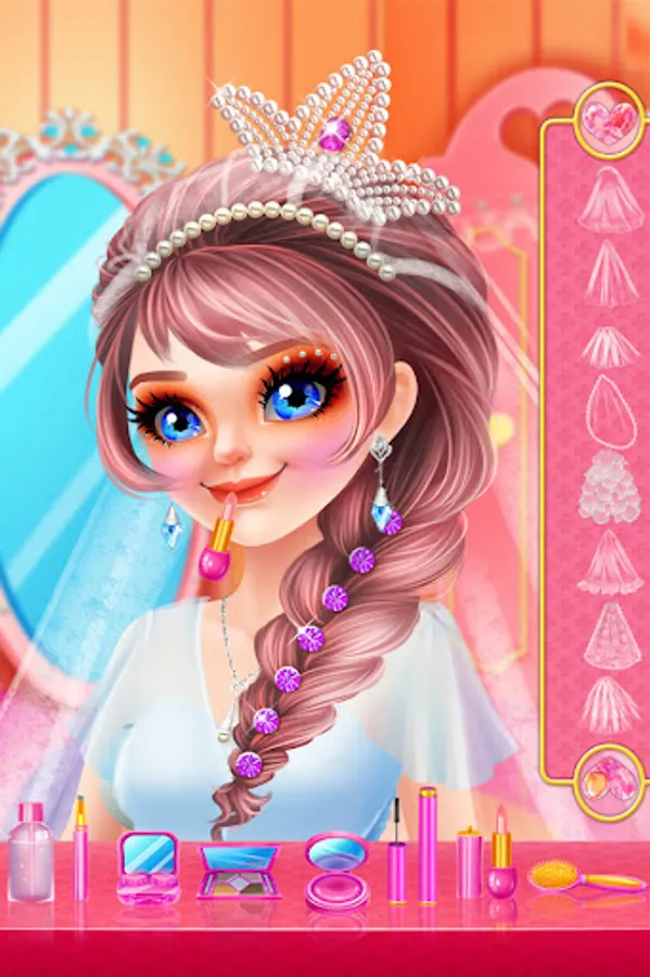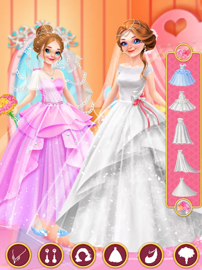I’ve been invited to George and Kayla’s wedding today. So let’s help our handsome groom and beautiful bride have a great wedding. You can make a handsome evening dress for the groom. You can also design a beautiful wedding dress and bouquet for the bride. Help the bride choose the shinny earrings and necklace, wear a dazzling crown, after dressing up the bride you can accompany the bride to do a premarital beauty, try different styles of exquisite make up. Make delicious dessert cake with a lovely ornament on the top. The bouquet toss is about to begin. Make sure you get it. Finally, shoot a perfect wedding dress for the bride and groom.