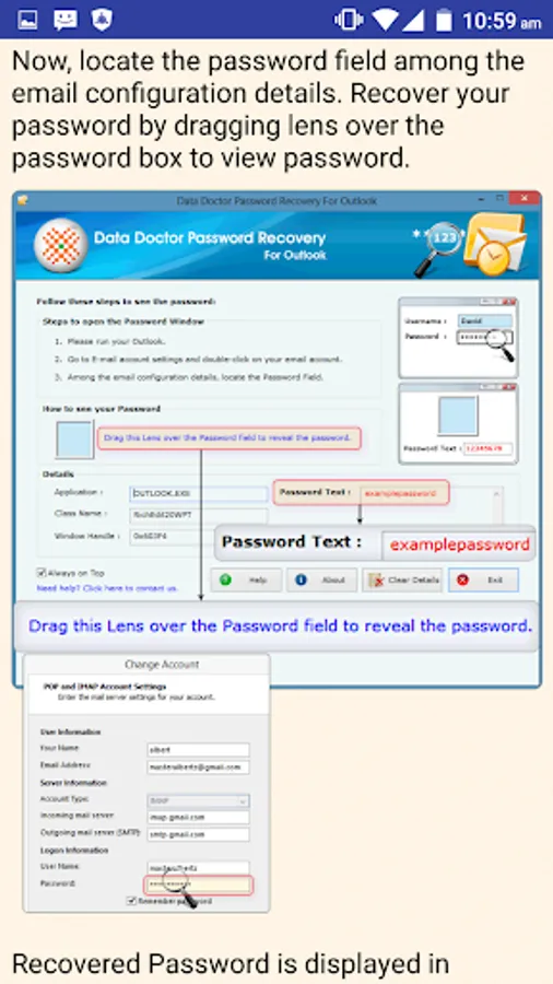 The app advises password unmask & Reveal steps to convert the password hidden behind asterisks or dots using respective Data Doctor Password Recovery Software for Windows. Data Doctor Password Recovery Software reveals saved passwords of all type of emails configured in all type of emails of all type of websites as well as Popular email services such as Gmail hotmail outlook yahoo AOL etc regardless you have configured POP3 SMTP or IMAP based settings over SSL TSL or standard authentication settings.