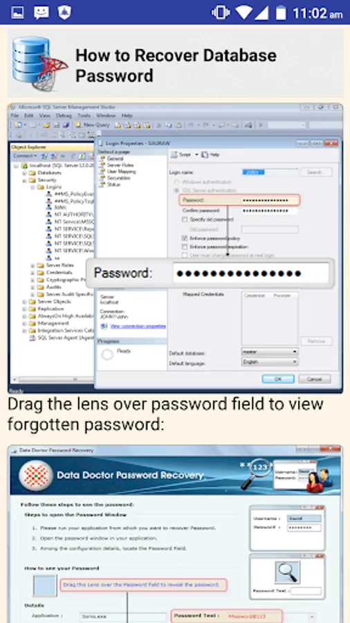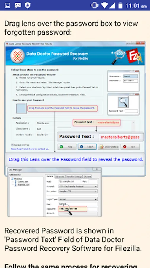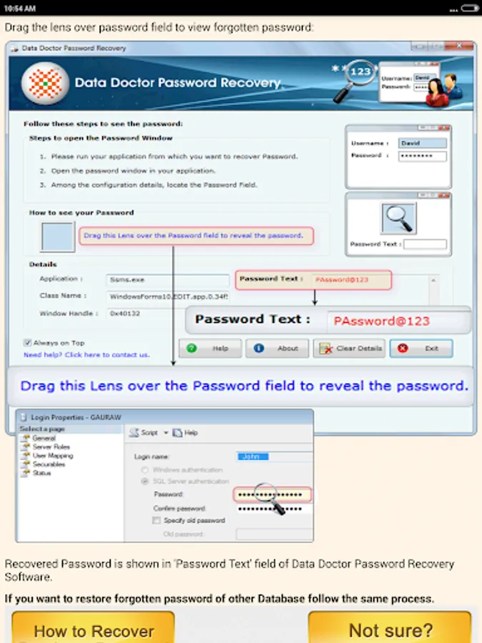 Forgot Password Recovery Help is free app that guides you to retrieve lost Passwords unmask & Reveal forgotten passwords saved in any windows based applications such as Email Clients FTP Server Clients Chat Messenger Database Software and Download Managers or Internet Browsers such as Internet Explorer Mozilla Google Chrome and Opera Etc.