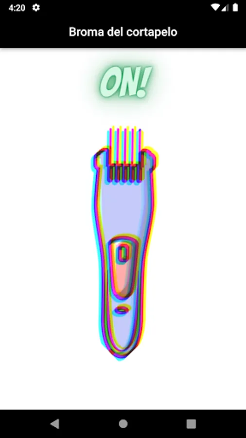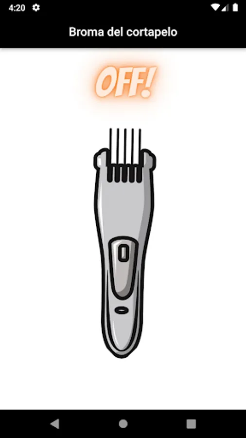 "Broma del cortapelo" es una aplicación de broma que simula el sonido y la vibración de una cortadora de cabello cuando tocas la pantalla. El usuario puede activar o desactivar el efecto cortapelos tocando la pantalla y ver un cambio en la imagen de fondo de la aplicación.