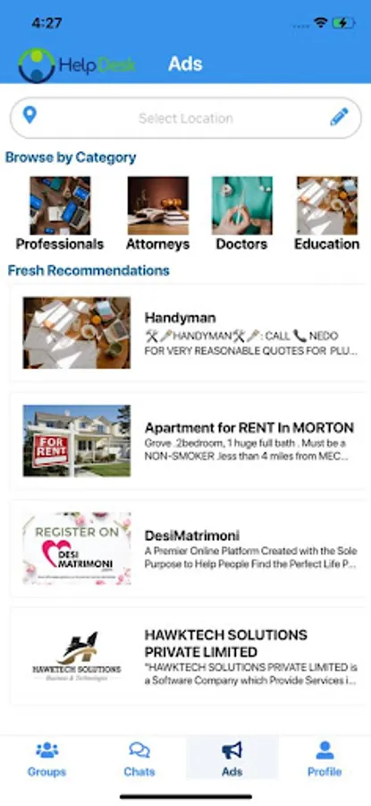 The HelpDesk group(s) on the app allows its users to post or share issues that they are faced with, and also provides them with the opportunity to correspond and interact with others who have experienced the same issues. Then, along with the help of experts from our organisation, the app gives its users the best route towards dealing with and solving those problem(s). Here, it may be noted that we charge only for banners, and local ads on a minimal scale. Some of the remarkable services that the app caters to, in the form of different group services, include the following: