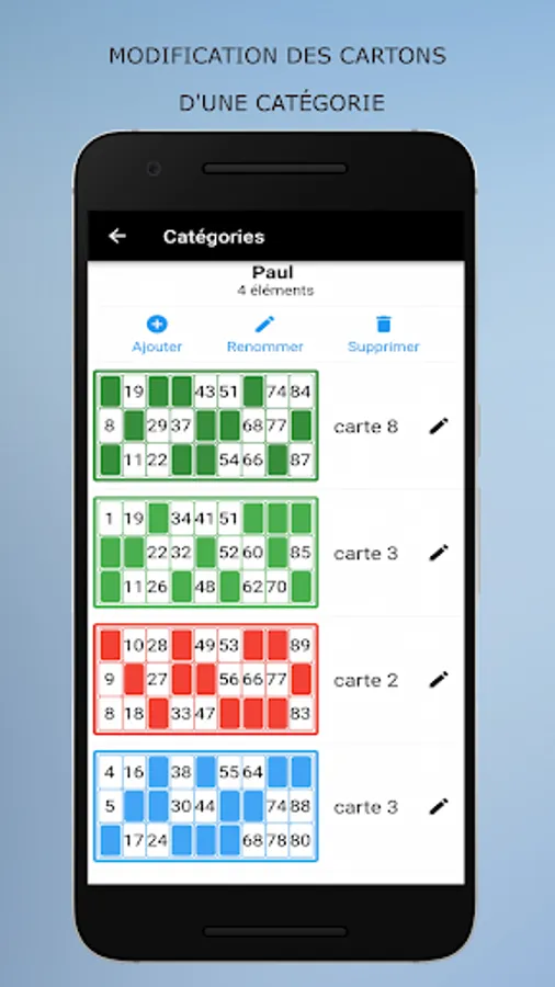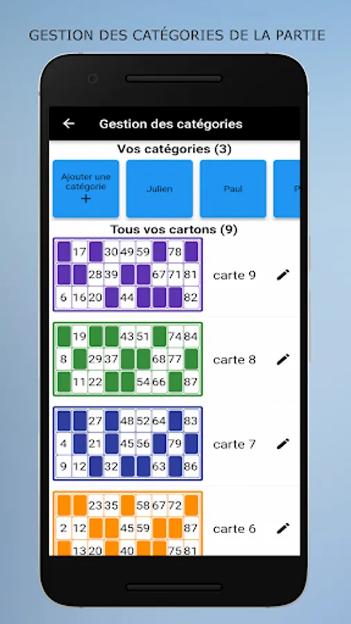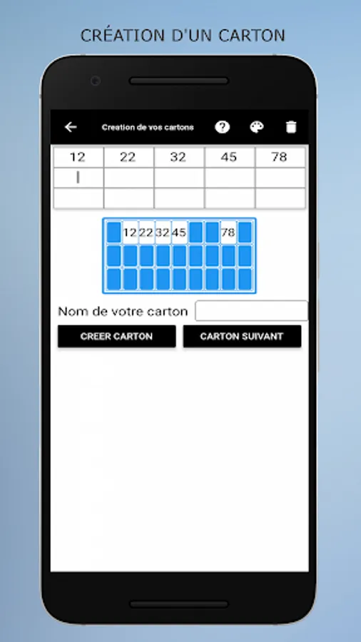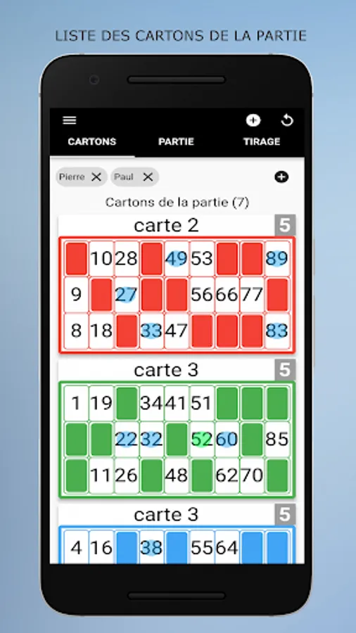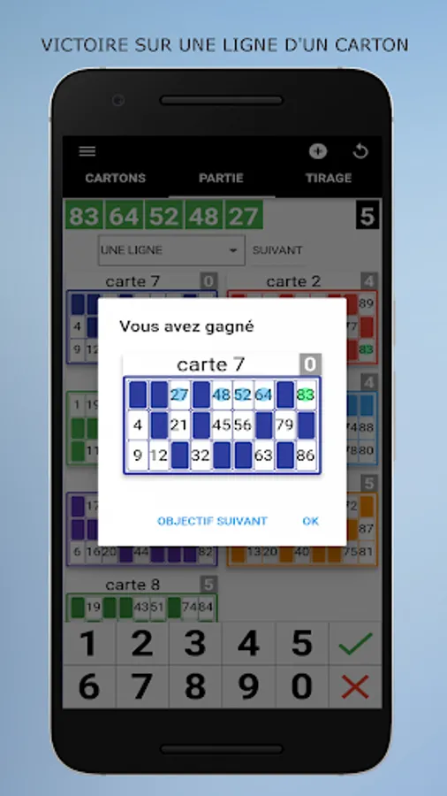 Loto Quine Helper is an application to help you during your associative lotto games. This utility will manage your different boxes as well as those of your friends or family. Just add the boxes in the app at the start of the lotto. Then during the draws, you enter the numbers announced and the applications will automatically manage your boxes, you will not have to use your boxes and tokens. At the start of the game you choose your goal from the list (one line, two lines, full boxes, ...), when it is reached a message will notify you. This application does not generate numbers, it only allows you to manage your boxes. Can also be used for rifles.