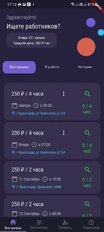 With our application, you can search for performers and get a part-time job in Krasnodar. Daily payments within 3 hours after the completion of work.