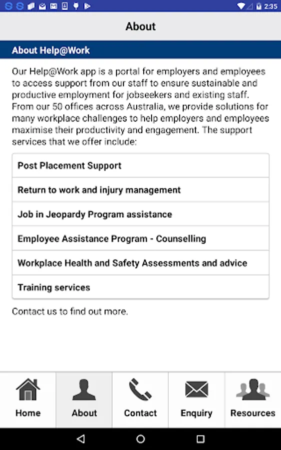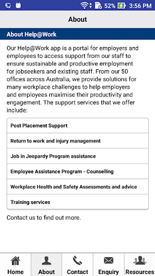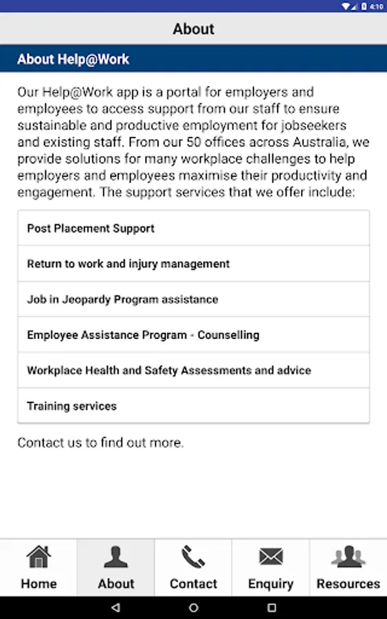 The Help@Work app is a portal for Australian employers and employees to access support from our staff to ensure sustainable and productive employment. We have many offices around Australia providing solutions for various workplace challenges to help employers and employees maximise their productivity and engagement.