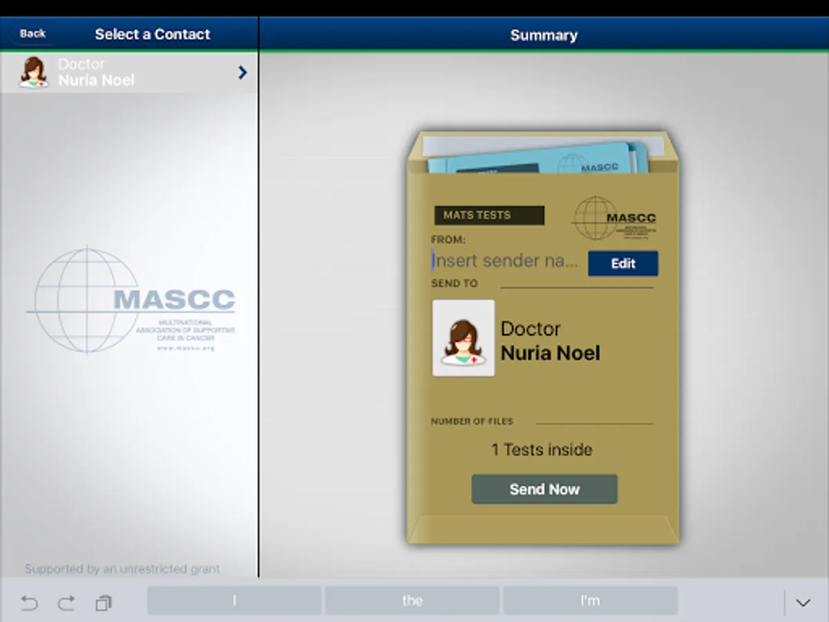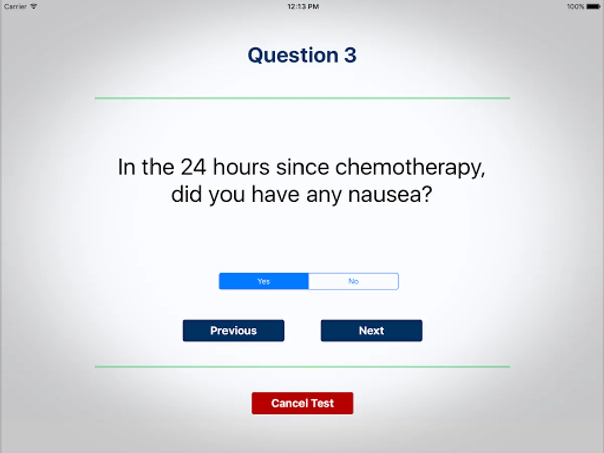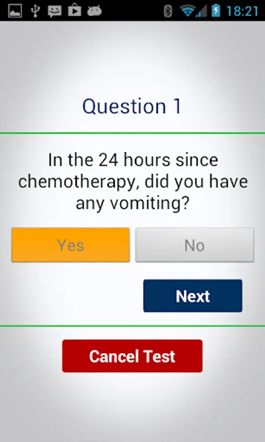 The MASCC Antiemesis Tool (MAT) is a questionnaire developed and validated by the Multinational Association for Supportive Care in Cancer (MASCC), recognized as the leading Supportive Care Organization in the world. It consists of 4 questions on the intensity and frequency of nausea and/or vomiting after a chemotherapy session, during the first 24 hours and the delayed period (from the day after to 4 days after chemotherapy). By completing the MAT test from their Android devices, patients have the possibility to send the records to their doctors or nurses in real time. In this way the health care professional can promptly follow up and manage the symptom.