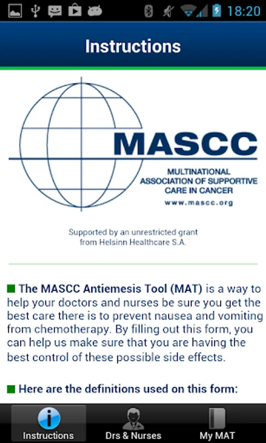 Patients fighting cancer have to deal with Nausea and Vomiting, potential side effects related to chemotherapy. MASCC Antiemesis Tool (MAT) is the first Android application for Cancer patients receiving chemotherapy that helps their doctors in evaluating if and how much the anti-cancer treatment is causing nausea and vomiting.