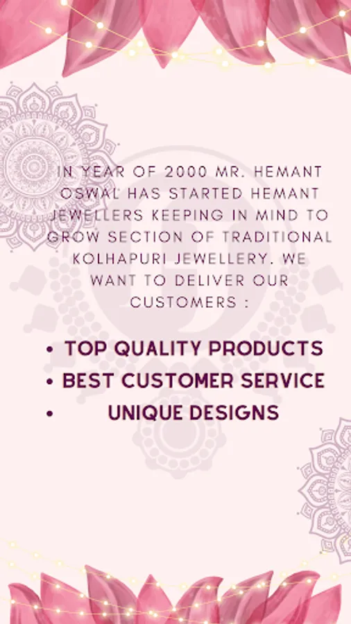 Hemant Jewellers vision is to create Kolhapur's most delightful jewellery collection that changes buyers view to see traditional jewellery from all over world. In the year of 2000 Mr. Hemant Oswal has started Hemant Jewellers keeping in mind to grow section of Traditional Kolhapuri Jewellery. We want to deliver our customers :
