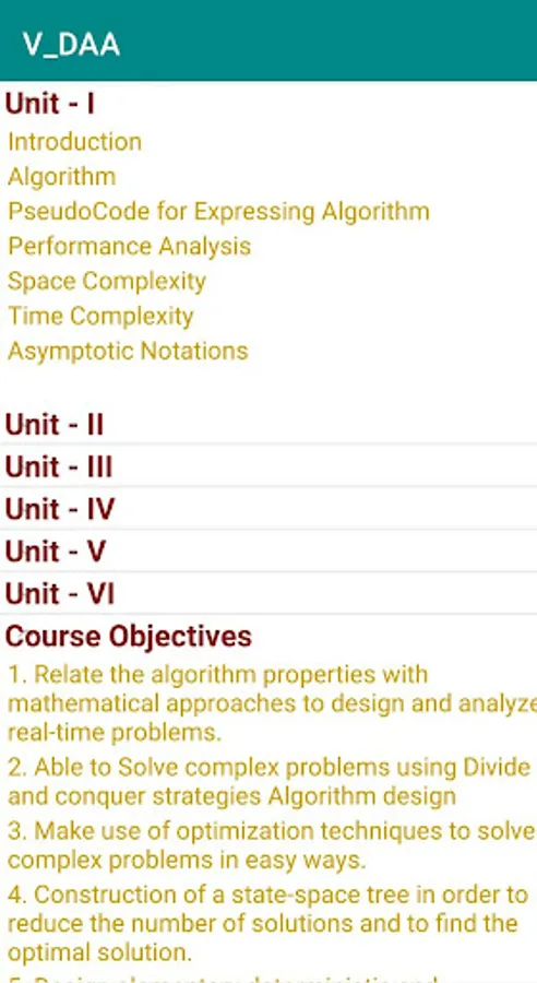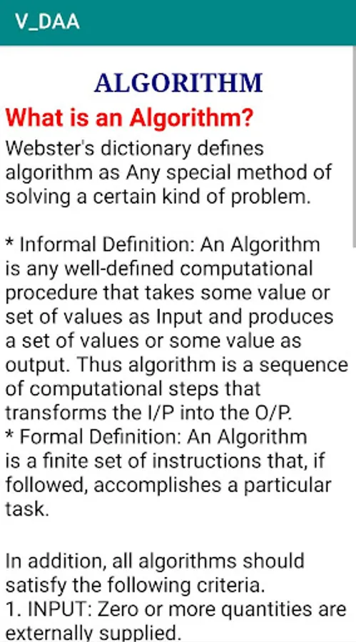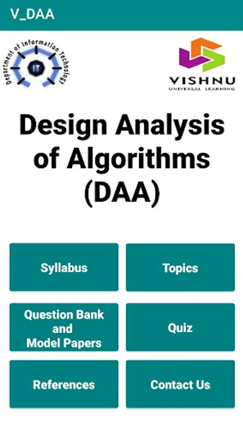 The app will be helpful for the CSE, IT and related branch students for easy learning of Design and Analysis of Algorithms (DAA) subject during Second Year of B.Tech. The V_DAA App is the mobile application, which is an easy way to learn in short time. In this app it covers all the topics in the DAA and help for writing competitive exams also. The students and people who want to get knowledge about the subject help them to learn in the easy manner. The app also includes the previous question papers, important topics.