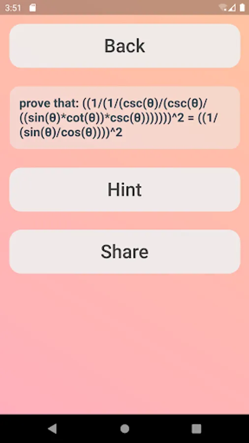 To use the application, first of all tap on generate button. This will take you on difficulty selection page. From here, you can select difficulty from 'Easy', 'Medium', 'Hard' and 'Tricky'. After tapping on the difficulty, it will show you question. You can also share question to anyone by tapping on share button. This application can help teachers as well as students from the beginning of trigonometry to its PhD. And the best part is that it is one time purchase!!!