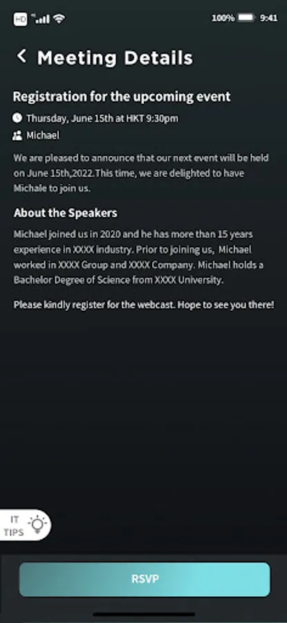 The Event feature is a one-stop event registration and management tool for both online webinars and in-person events. You can easily go to Account > My Event or Features > Event to access event sessions, speakers, and logistics details. For all event registration, you may RSVP on HConnect with one simple click.