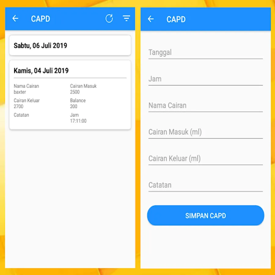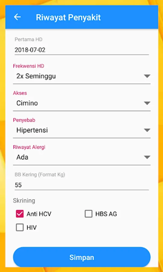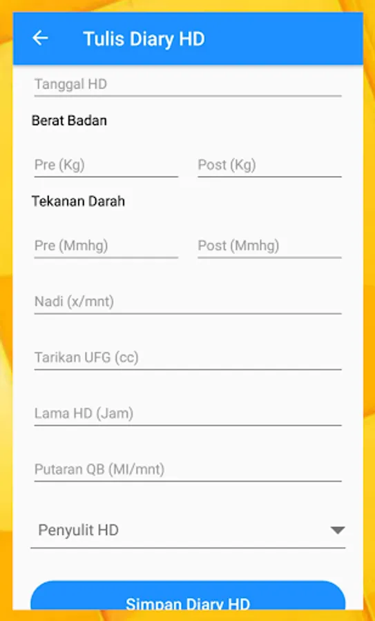 Diary Hemodialisis merupakan aplikasi yang dapat membantu mencatat aktifitas Rutin HD anda, dan catatan rutin HD anda disimpan secara permanen disini. Hasil dari catatan HD anda di rekam secara detail, meliputi :
