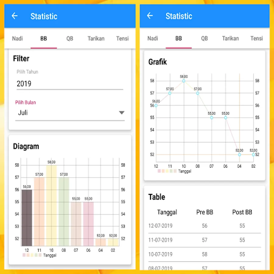 Hasil catatan ini juga ditampilkan secara detail yang disajikan dalam bentuk diagram, grafik dan tabel. Dan dirangkum berdasarkan kelompok harian, mingguan, bulanan dan tahunan, Sehingga anda bisa melihat secara detail perubahan kenaikan BB, tensi