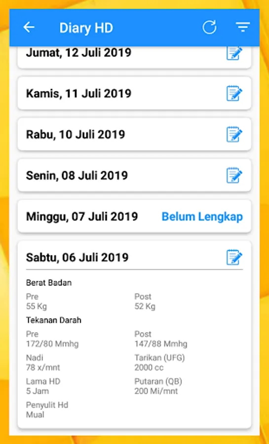 Diary Hemodialisis merupakan aplikasi yang dapat membantu mencatat aktifitas Rutin HD anda, dan catatan rutin HD anda disimpan secara permanen disini. Hasil dari catatan HD anda di rekam secara detail, meliputi :