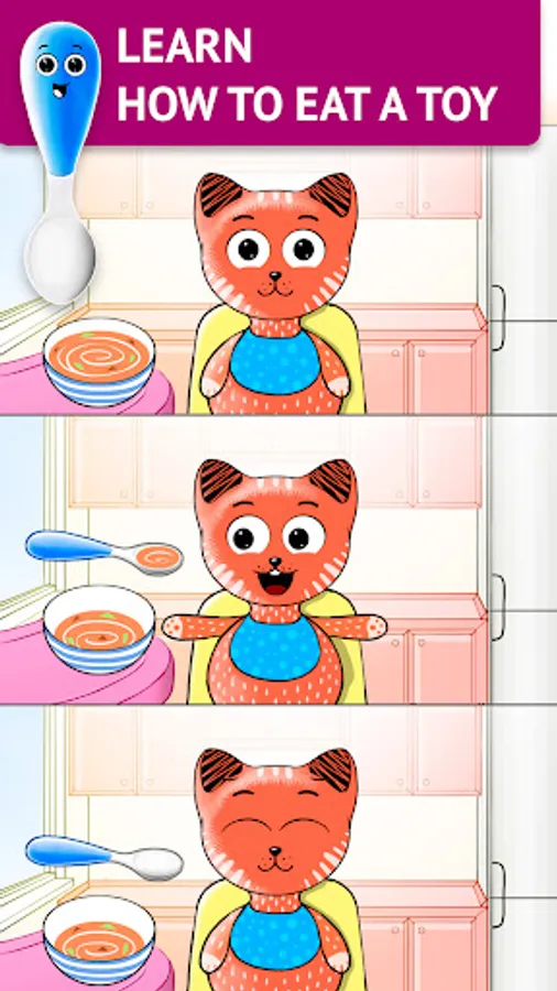 - Need external helper to learn to eat? Here is baby kitty toy. So here baby pet games takes a new level. This baby Kitty will learn your toddler how to eat.
