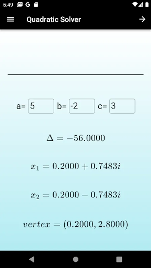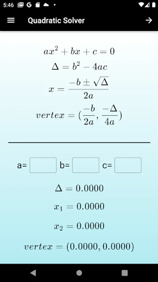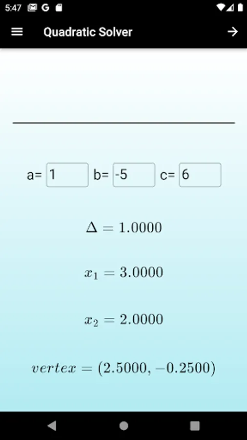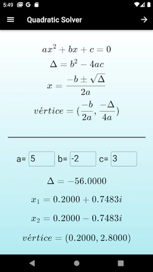Just put the coefficients in the appropriate field and see the roots. The app also shows the vertex of the second-degree function whose coefficients were taken as inputs,besides that it has an option to make a graph of the function.