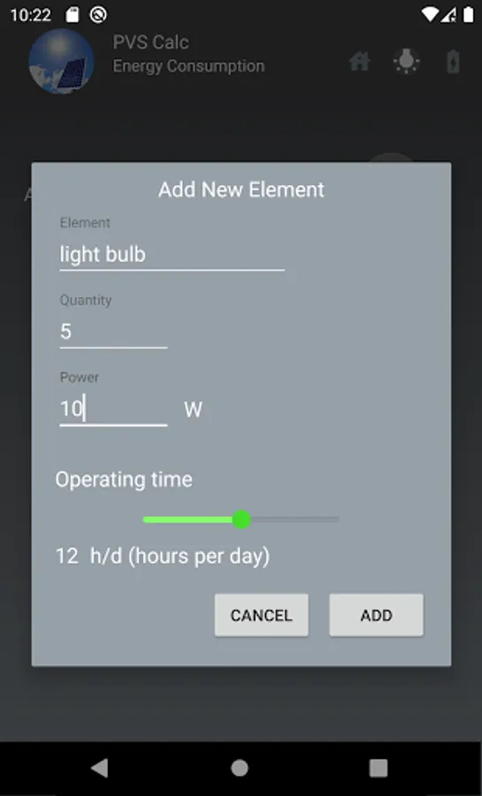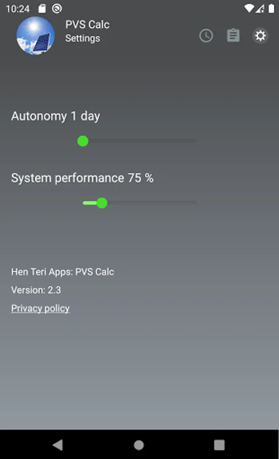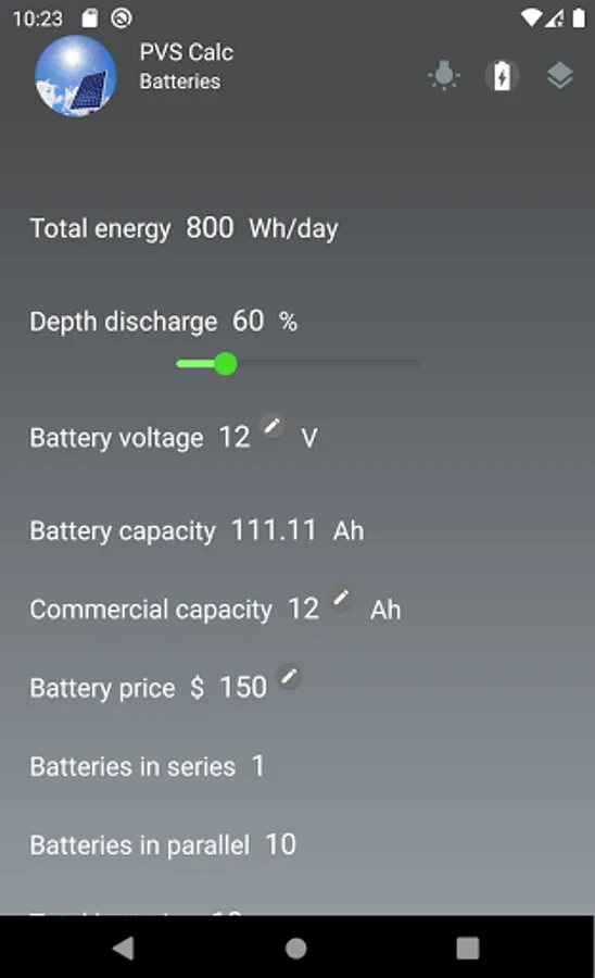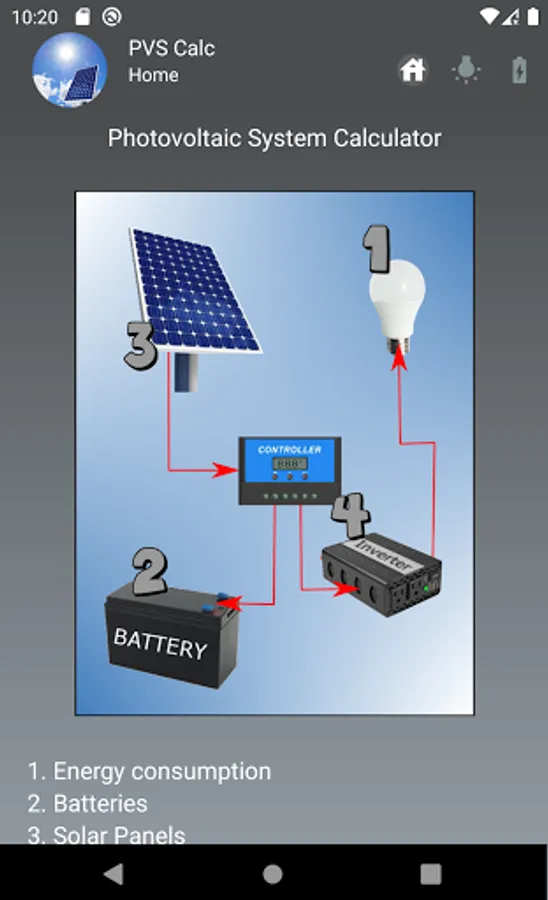 Application to calculate a photovoltaic solar system; Panels, batteries, charge controller and inverter, also allows to know the costs and time to recover the investment.