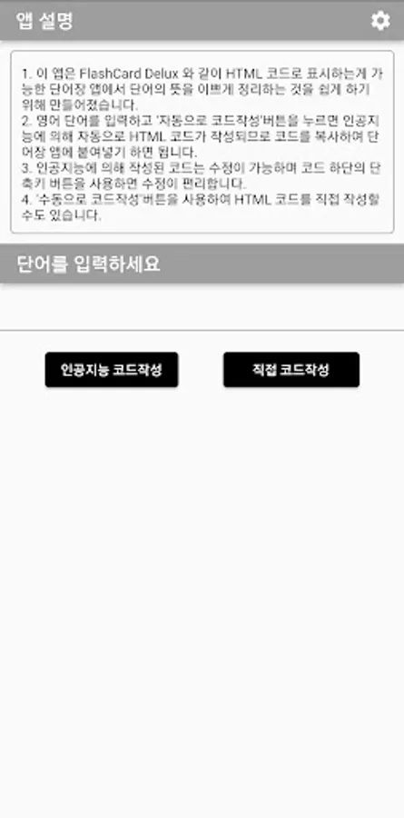 If you enter an English word and press the 'Create AI Code' button, HTML code is created automatically by artificial intelligence, so you can copy and paste the code into your vocabulary app.